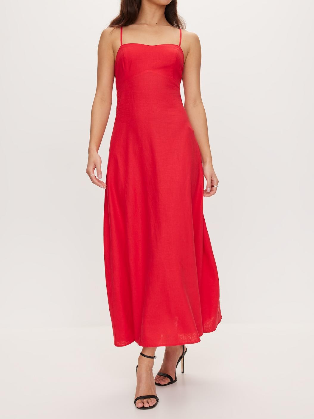 Our linen blend Beau slip dress is mid length with a sweetheart neckline, fit n flare fit, low cut back with a stunning bow wrap detail. Entry with side seam invisible zip and adjustable straps.