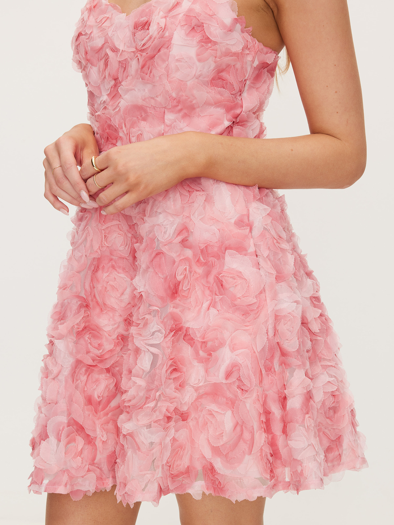 Be the rose among the thorns in this stunning mini! With 3D texture and in perfect soft pinks, pair with our rosette hair claw for your next garden party! Adjustable straps, zip closure, Sweetheart neckline