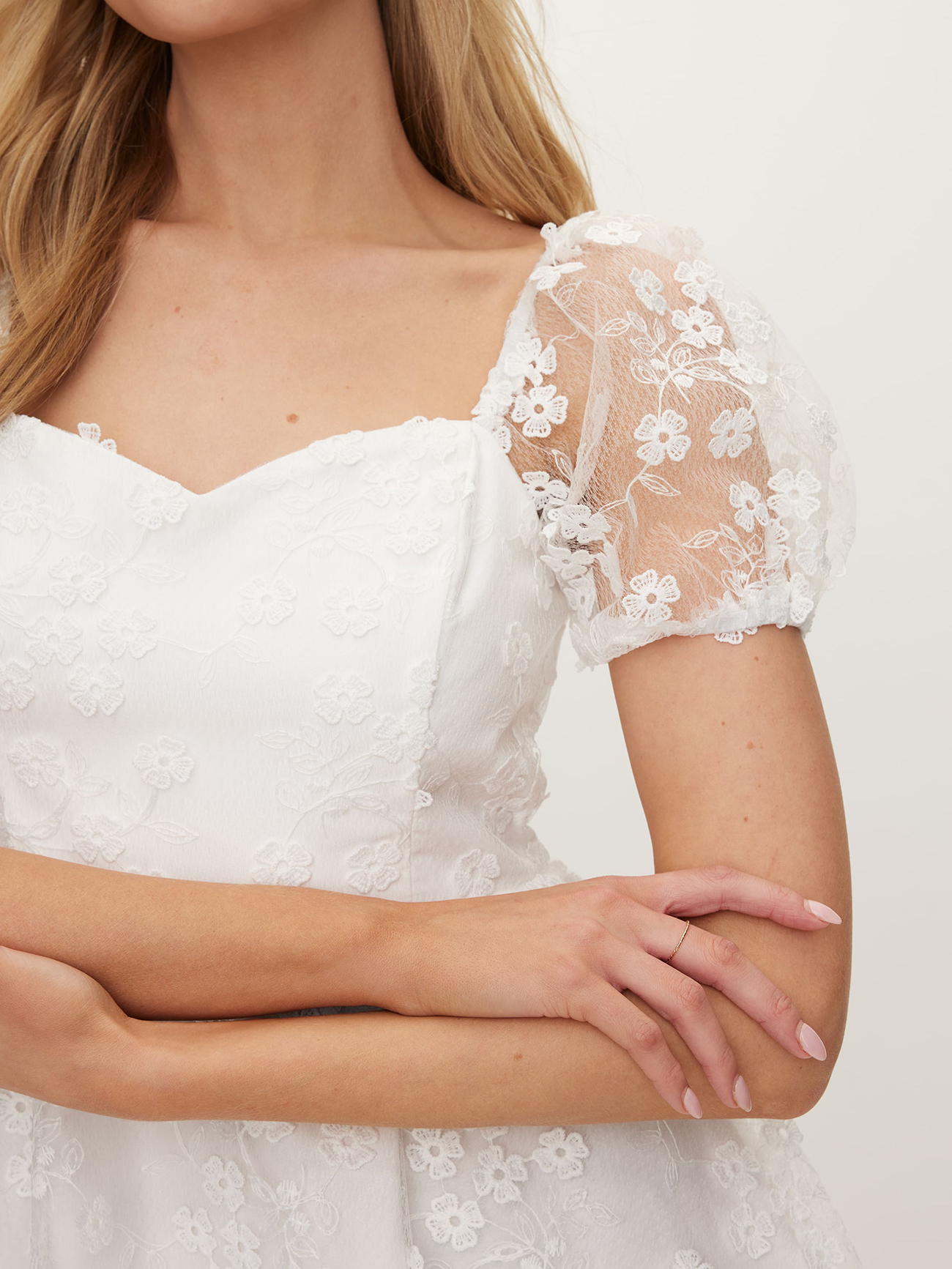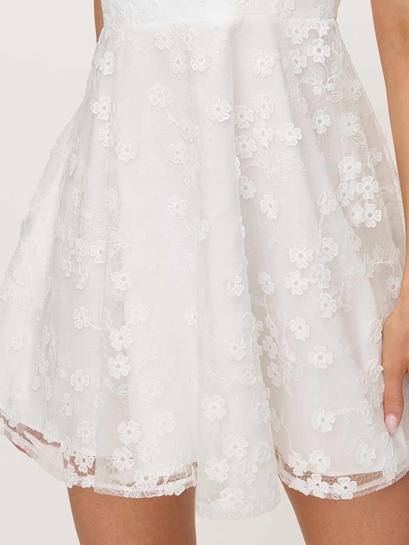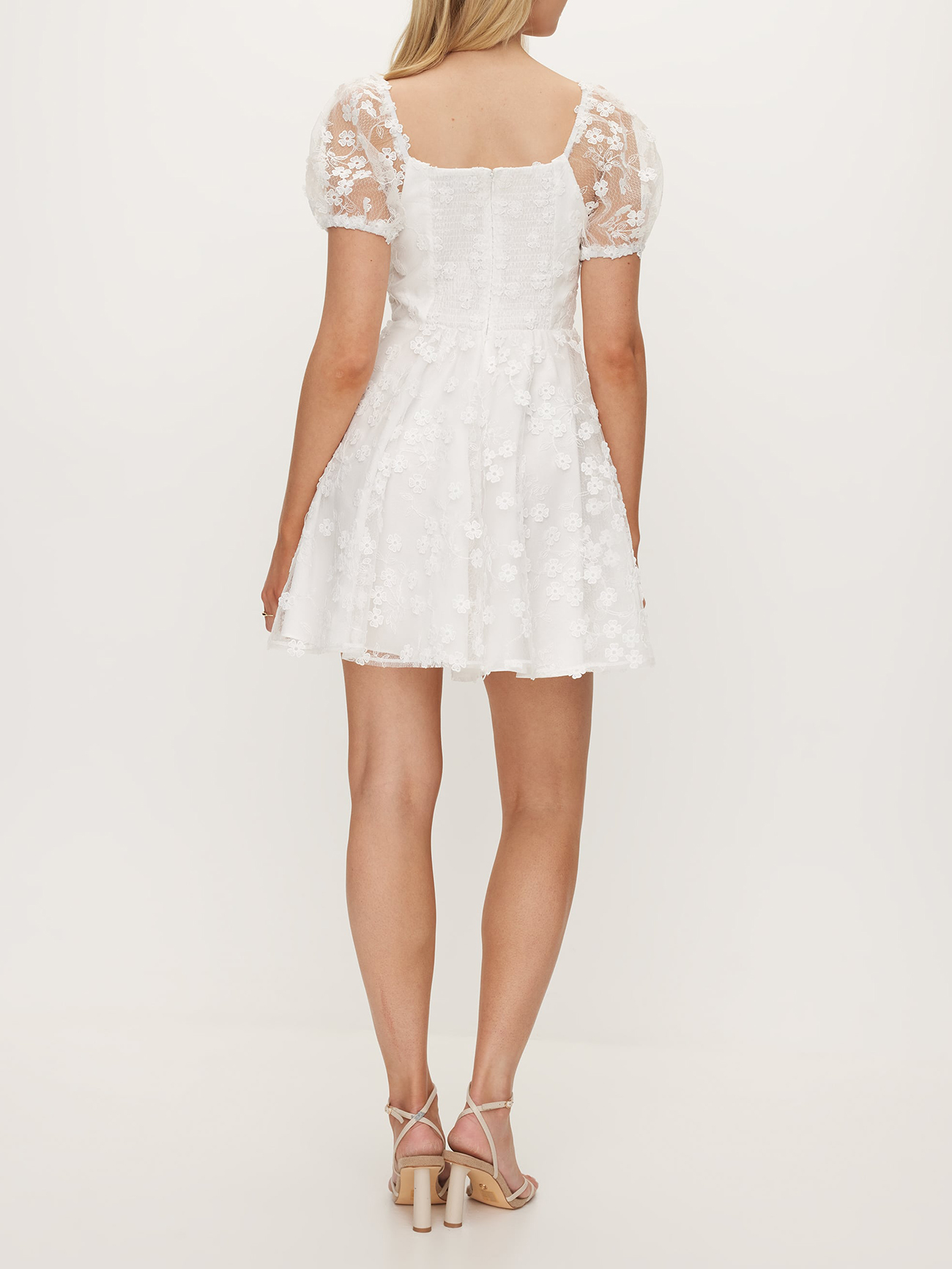 Fall in love with this sweet mini dress. With 3D floral applique and in a flattering fit and flare shape, pair with a simple heel and a simple bag to let the dress do the talking!