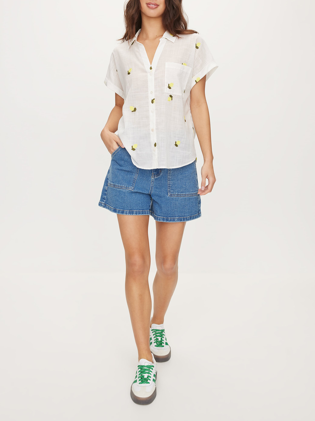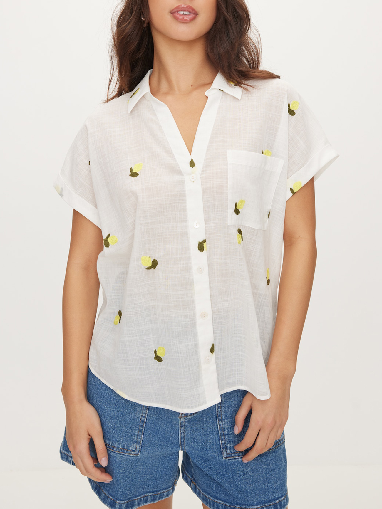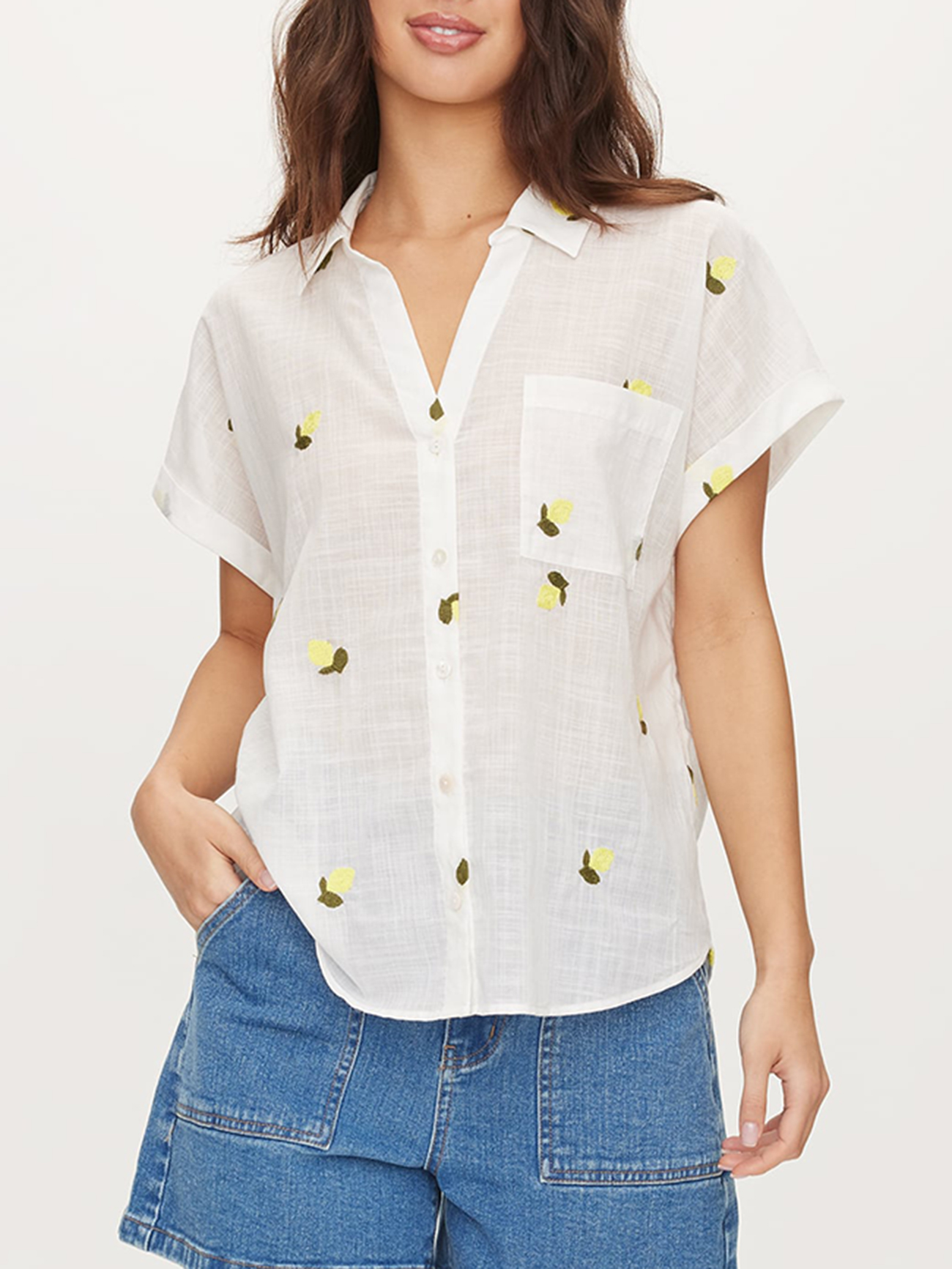 The Lightweight Embroidered Shirt is fun and breazy. Pair this shirt with cute denim or line shorts and straw hats to take on the sun!